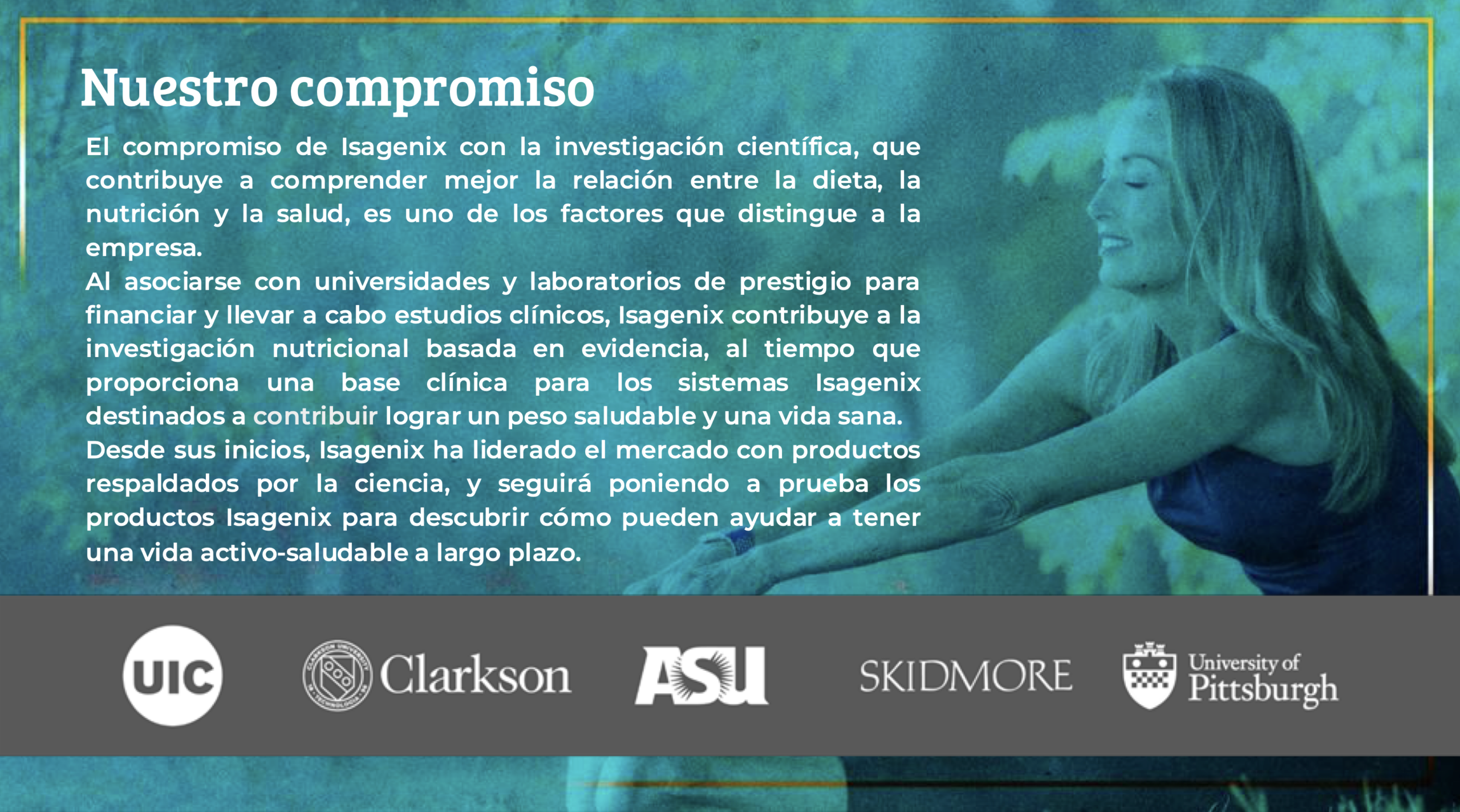 Desde su creación, Isagenix ha llevado la delantera con sus productos respaldados por investigaciones científicas y continúa poniéndolos a prueba. Isagenix se ha asociado con universidades y laboratorios respetados, lo que le permite contribuir a la investigación nutricional basada en resultados, a su vez proporciona fundamentos científicos que corroboran los efectos de sus sistemas enfocados en: pérdida de peso y llevar una vida saludable.