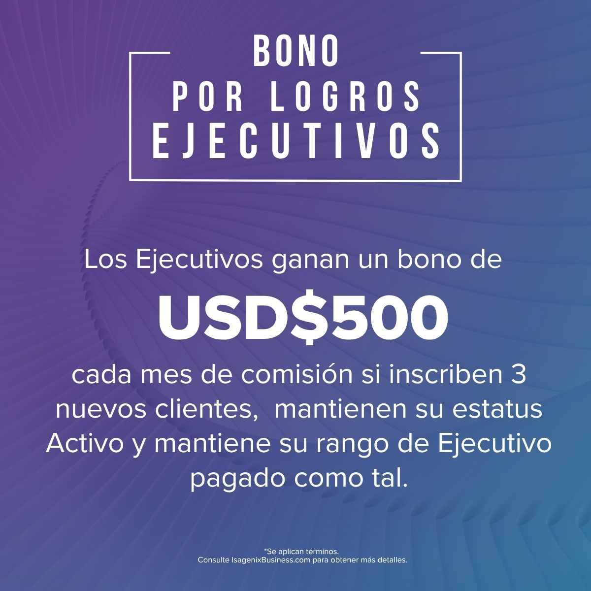 *Los asociados independientes de Isagenix tienen derecho a recibir un Bono por Logros Ejecutivos de 500 USD (o su equivalente en el mercado según el tipo de cambio establecido) (El bono si: (1) mantienen el rango de Ejecutivo, pagado como tal, todos los días de un mes de comisión calificado entre el 28 de julio de 2025 a las 12 a.m. ET y el 25 de enero de 2026, 11:59 p.m. ET (el «Período de Promoción»); (2) en el mismo mes de comisión inscriben a un mínimo de tres nuevos asociados independientes o clientes preferentes con un pedido inicial de 100 VC o más en Suscripción a Beneficios y; (3) estar personalmente activo, realizando un pedido calificado de 100 VC o más dentro del periodo de la promoción y las fechas de comisión calendario Isagenix.