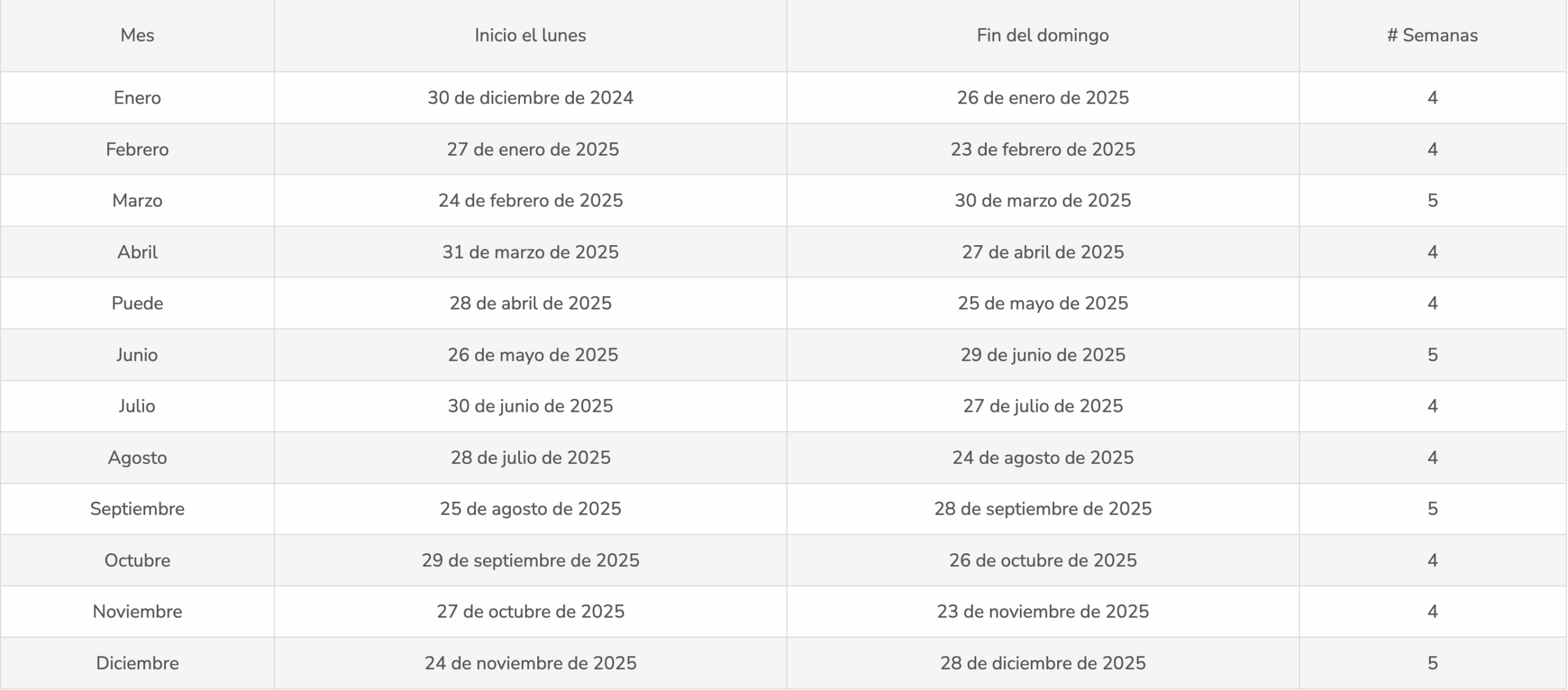 La siguiente tabla muestra las semanas de comisión para 2025, con las fechas de pago de comisiones relacionadas.